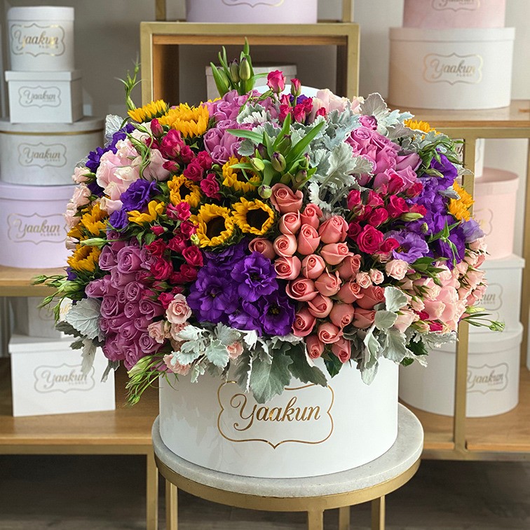 Hermoso diseño floral en caja circular blanca con 200 rosas, tulipanes, girasoles y follajes finos.
