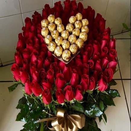 Demuestra tu amor en grande con esta preciosa canasta con 100 rosas rojas de exportación y aproximadamente 25 chocolates Ferrero Rocher en forma de corazón montados en el centro. Tiene una altura aproximada de 60 a 70 cm.