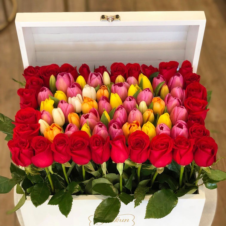 Dale una romántica sorpresa a tu ser amado con este hermoso cofre en color blanco con 10 rosas y 50 tulipanes en distintas tonalidades.