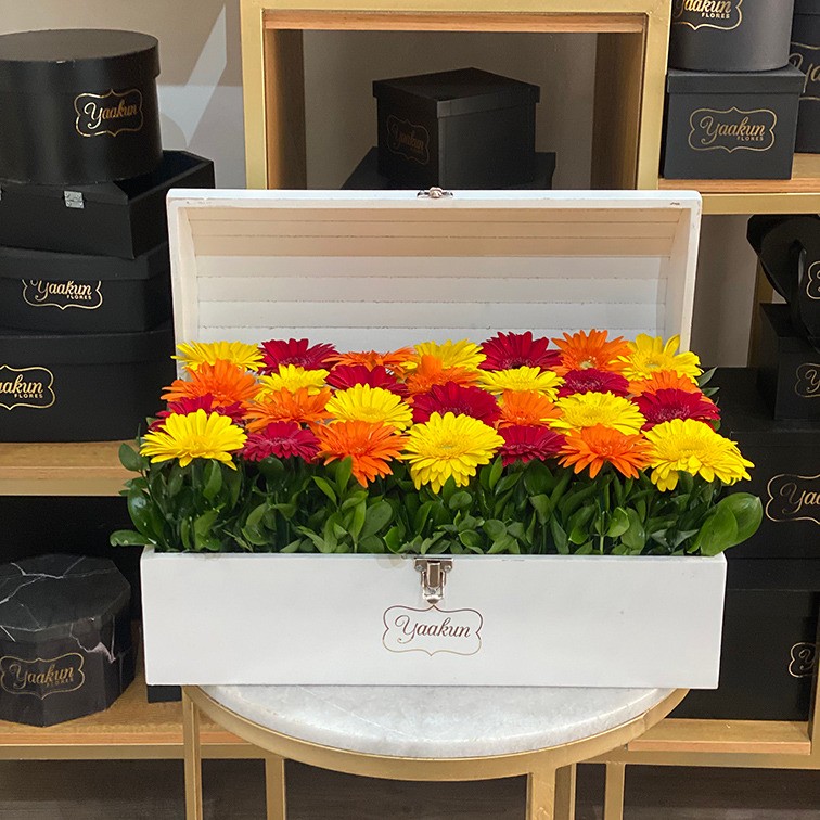 Colorido cofre grande en color blanco con Gerberas en distintos colores y forraje.