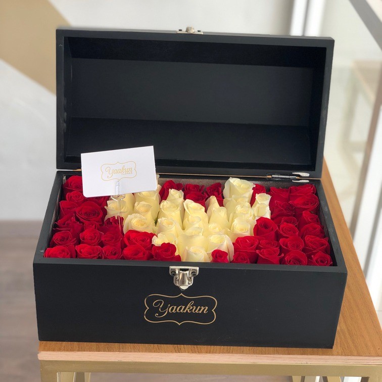 Ideal para regalar en fechas especiales como 10 de Mayo o 14 de Febrero, este magnífico cofre en color negro clásico, contiene 70 rosas rojas con un corazón en rosas blancas.