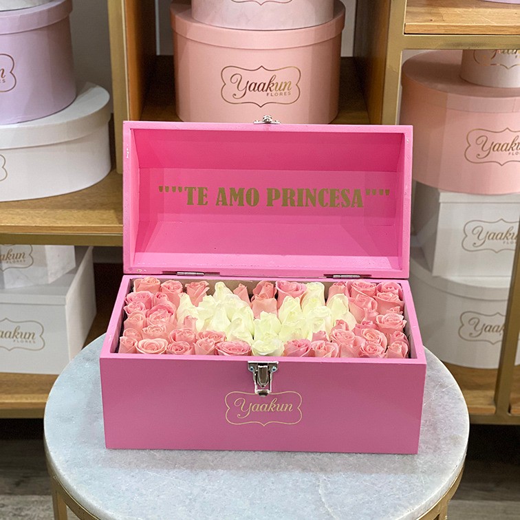 Cofre personalizado en color rosa con rosas en tonos rosas y un corazón hecho en rosas blancas.