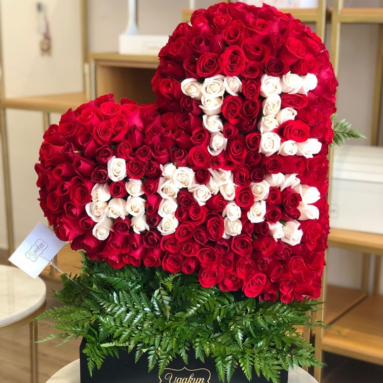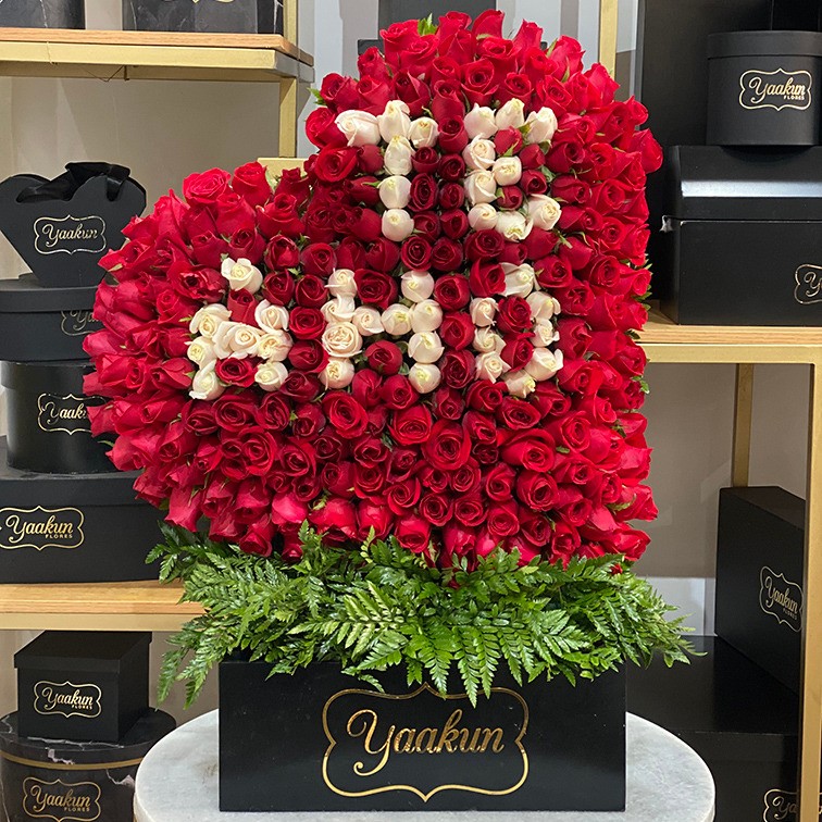 Expresa lo que sientes con este precioso diseño floral en forma de corazón elaborado de 250 rosas rojas y las palabras “Te Amo” en rosas blancas, montado en posición inclinada sobre una base de madera con follaje de clavo japonés.