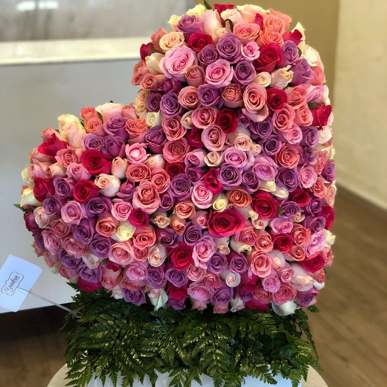 Envíe sus mejores deseos con esta escultura en forma de corazón elaborado con 250 rosas en tonos pasteles, montado en posición inclinada sobre una caja y follaje.