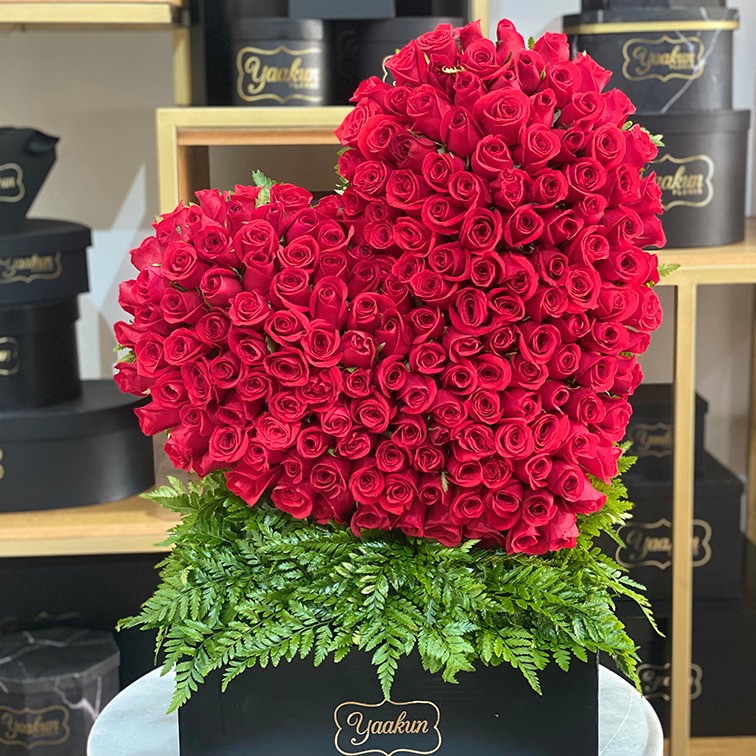 Llamativo corazón elaborado con 250 rosas rojas sobre una caja negra