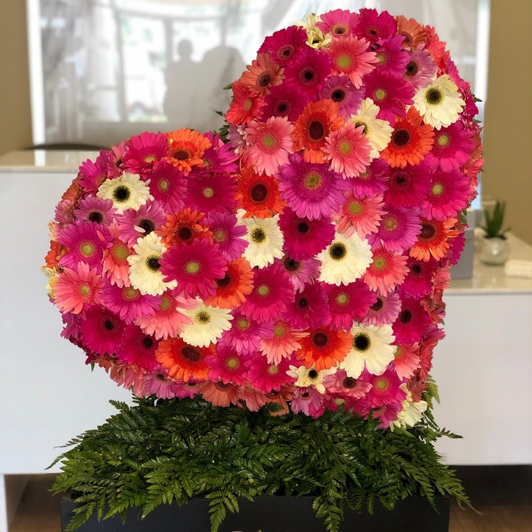 80 gerberas en distintas tonalidades montadas en forma de corazón sobre una base de madera.