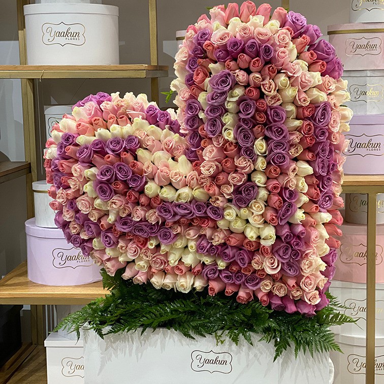 Corazón inclinado elaborado con 400 rosas en tonos pasteles