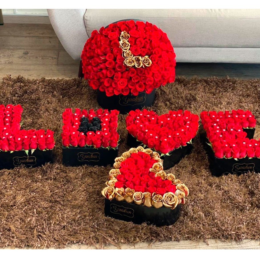 Juego de 6 cajas color negro con rosas formando la palabra LOVE, un caja en forma de corazón y esfera de rosas con iniciar a elegir (solicitar en las indicaciones).