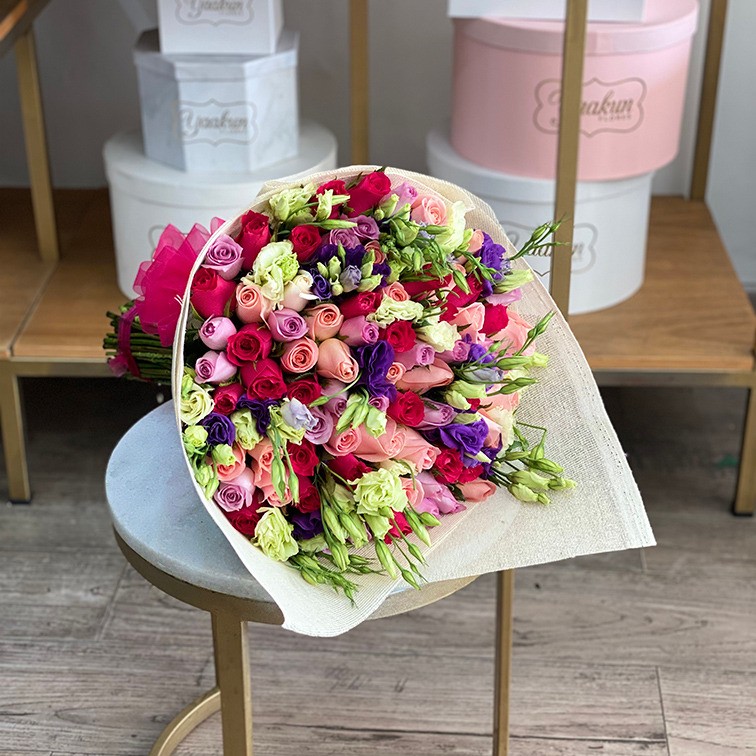 Dale un detalle muy romántico, envíale este fino ramo con 75 rosas de colores calidad de exportación, lisianthus morados y rosas con yute y moño fucsia.