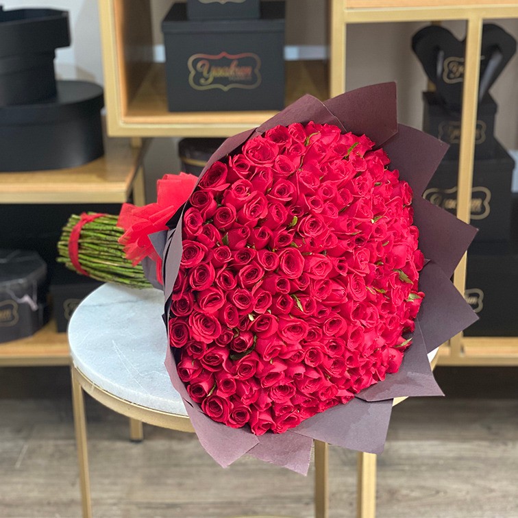 Los clásicos no pasan de moda. Envía este precioso ramo de 150 rosas rojas calidad de exportación con yute y moño de organza.