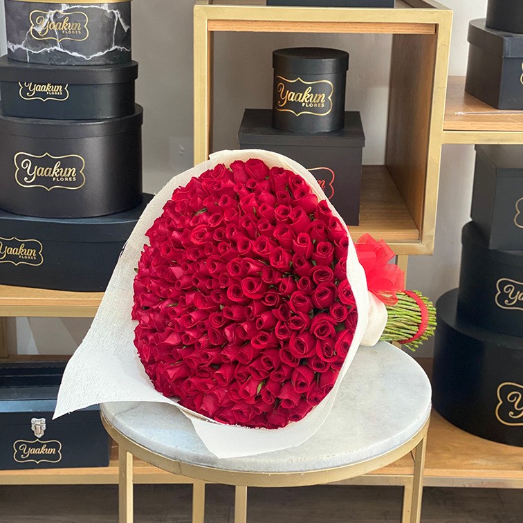 Envía tu amor con este precioso ramo de 200 rosas rojas calidad de exportación con yute y moño de organza.