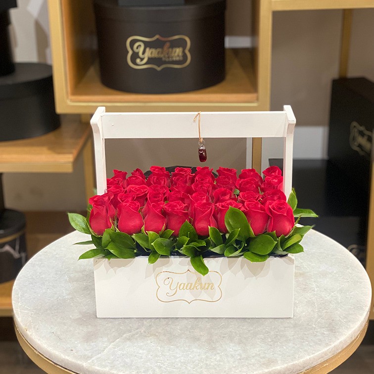 Perfecta para el 14 de Febrero, esta romántica jardinera lleva en su interior 28 rosas rojas con follaje ruscus y un dije de cristal en forma de corazón.