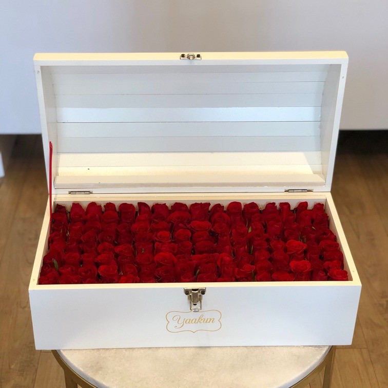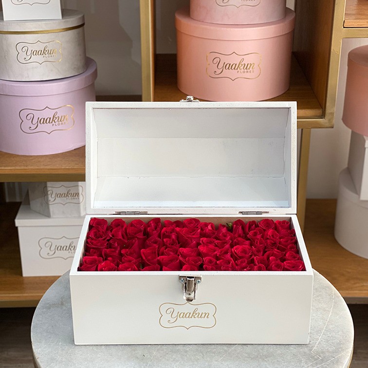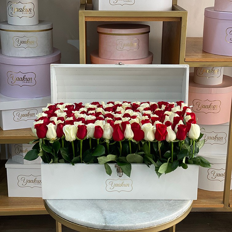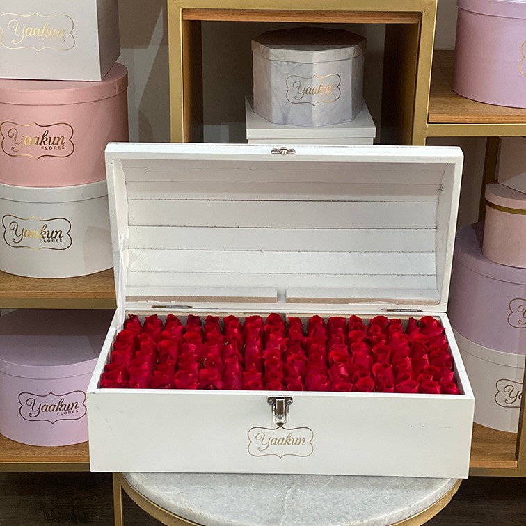 Cautivador cofre en color blanco, elaborado con 130 rosas rojas calidad de exportación.