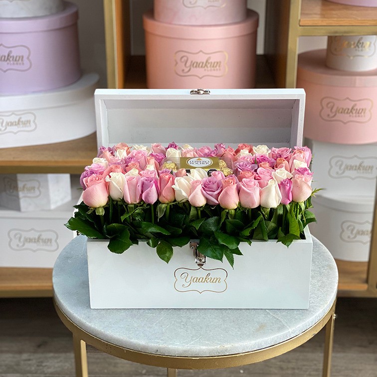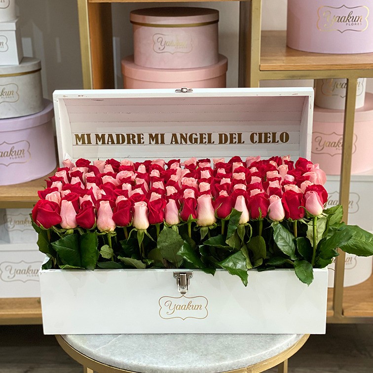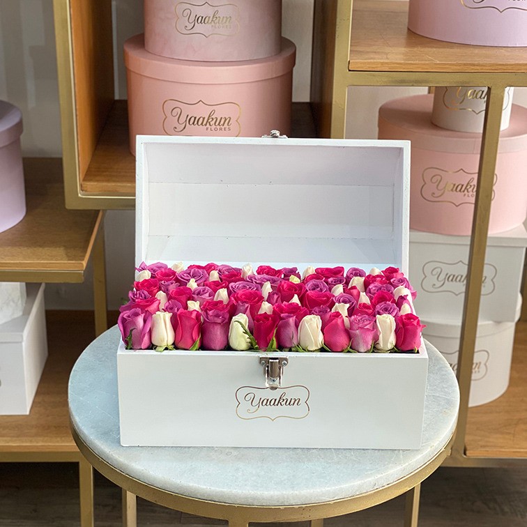 Exclusivo cofre blanco con 3 tipos de rosas en tonalidades blanco, rosa pastel y rosa.