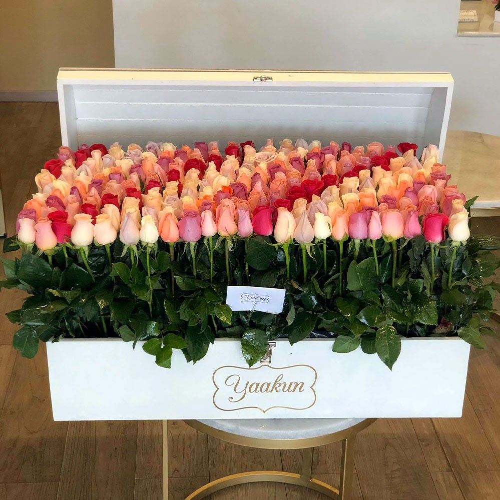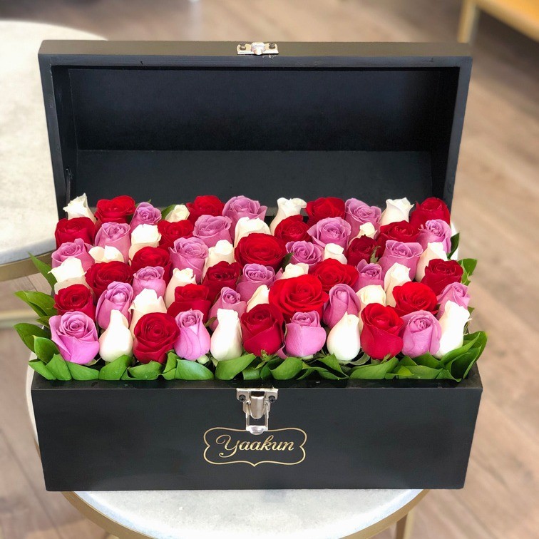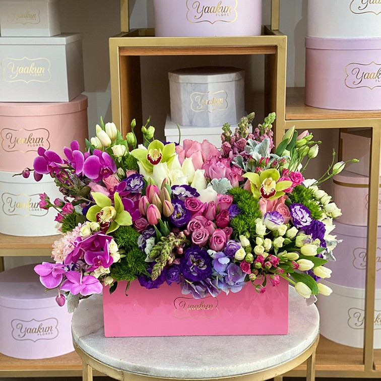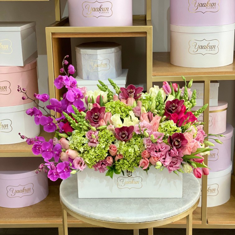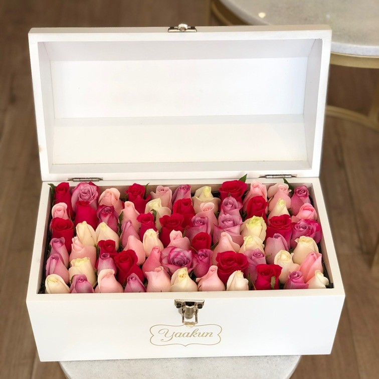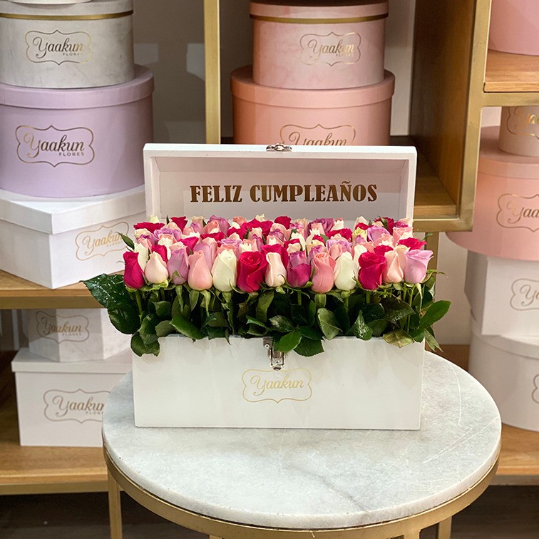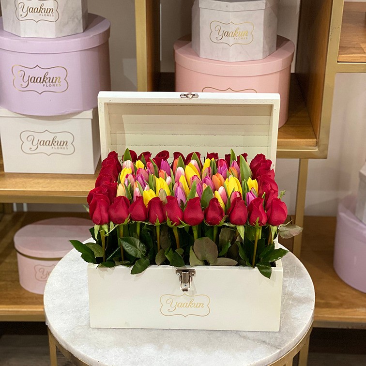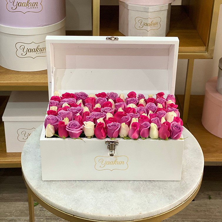 Cofre mediano en color blanco con 75 rosas finas como orquídeas, tulipanes, hortensias y amaranto.