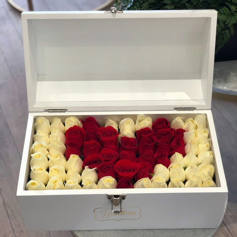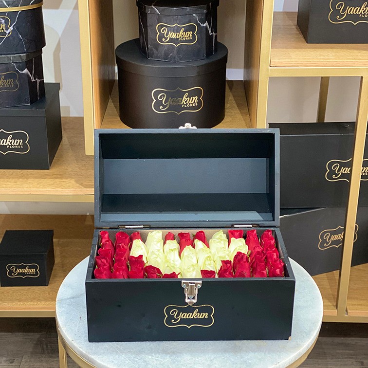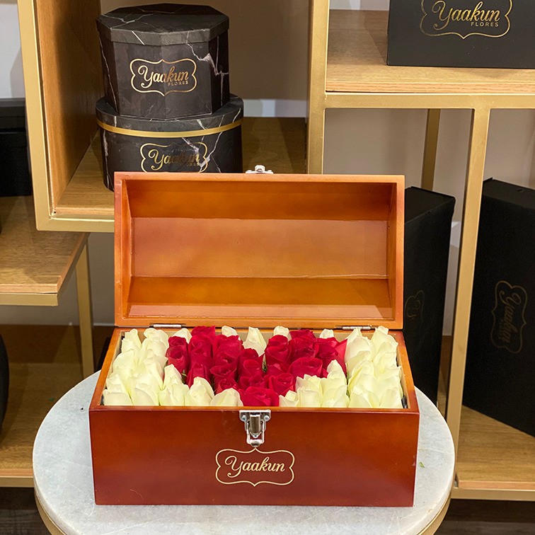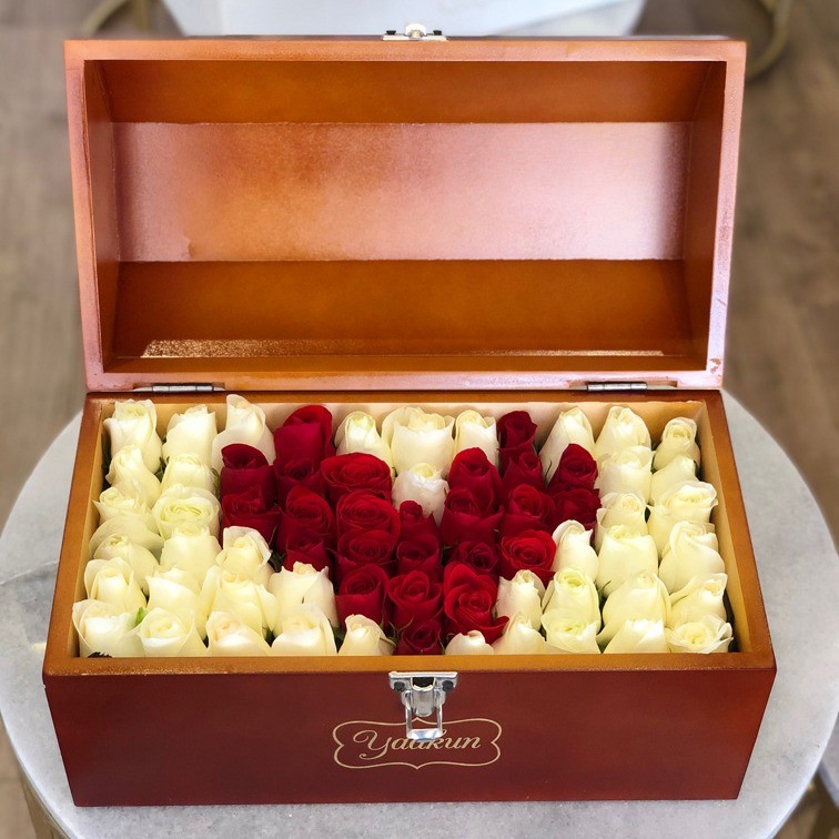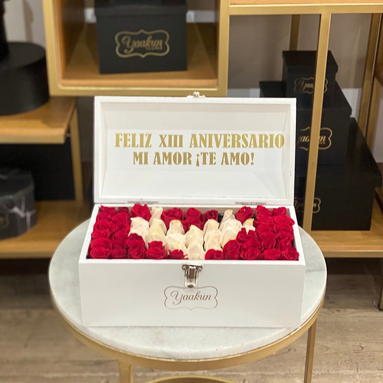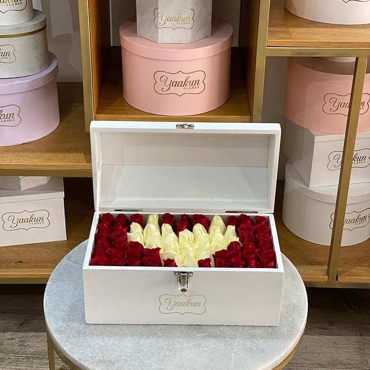 Cofre caoba con rosas rojas y un hermoso corazón hecho de rosas blancas.