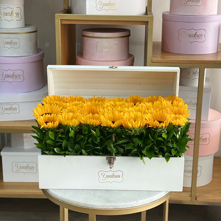 Brillantes girasoles en un cofre Yaakun en color blanco.