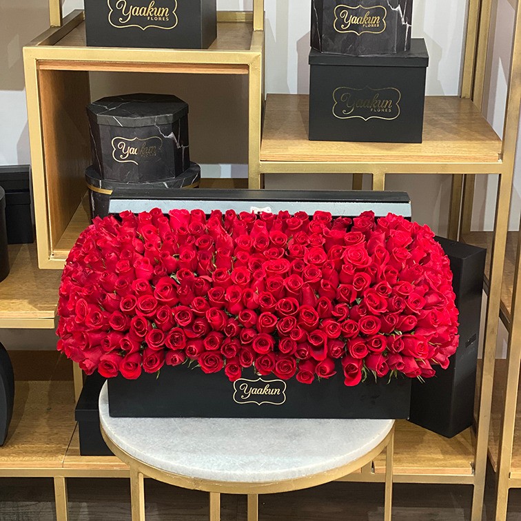 Hermoso diseño en cofre mediano con 220 rosas rojas de invernadero.