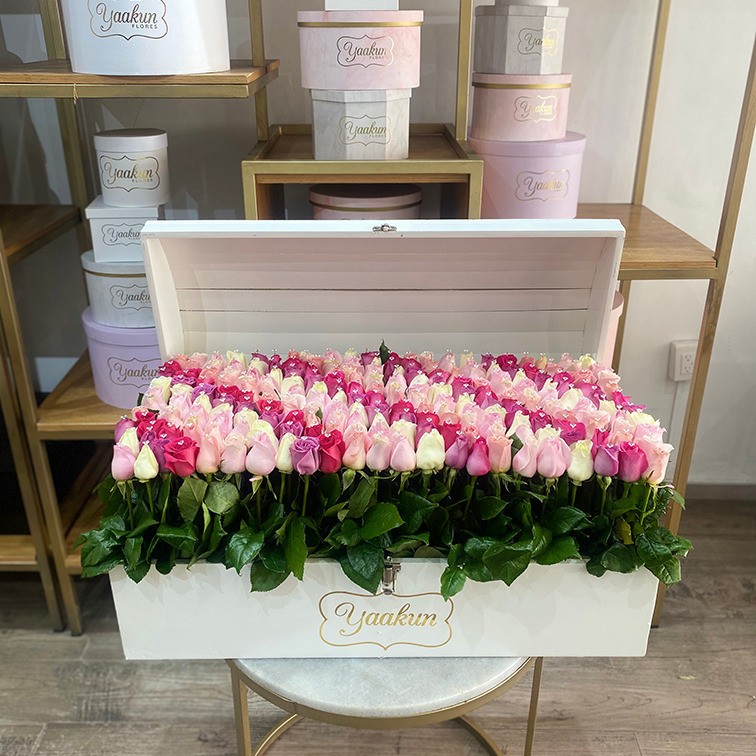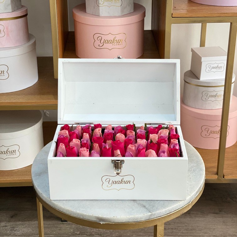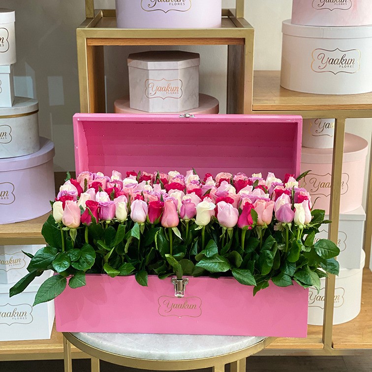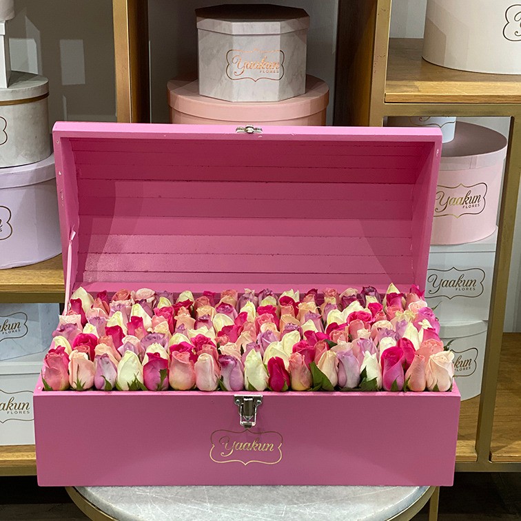 Romántico cofre de madera en color rosa con 130 rosas en tonalidades pastel.