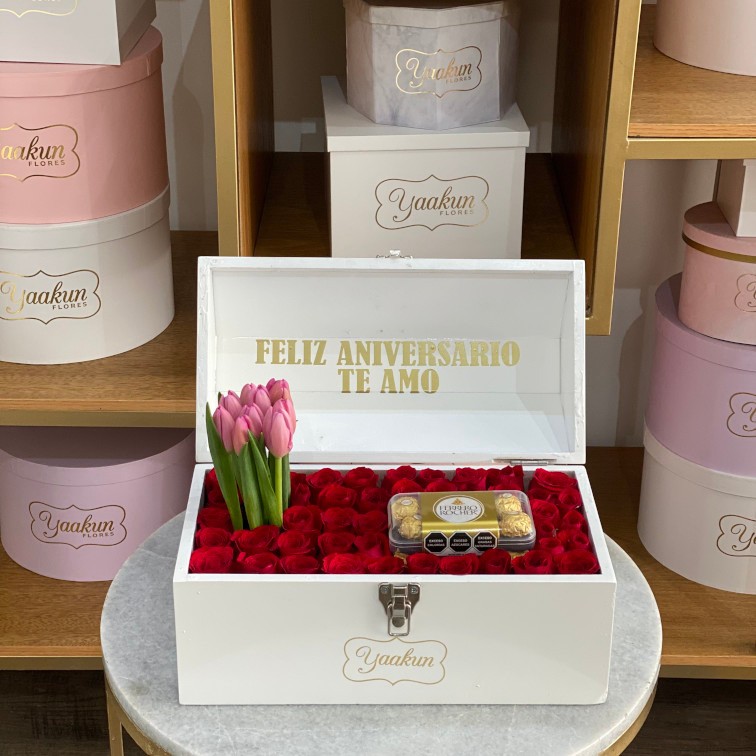 Si buscas un regalo elegante y sofisticado, este diseño floral te encantará. Consta de un cofre con 50 rosas rojas, 10 tulipanes y una caja de 16 chocolates Ferrero Rocher.