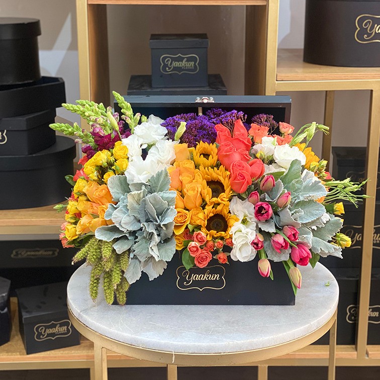 Cofre negro primaveral con 50 rosas, girasoles, lisianthus, baby rose, tulipanes y follajes finos