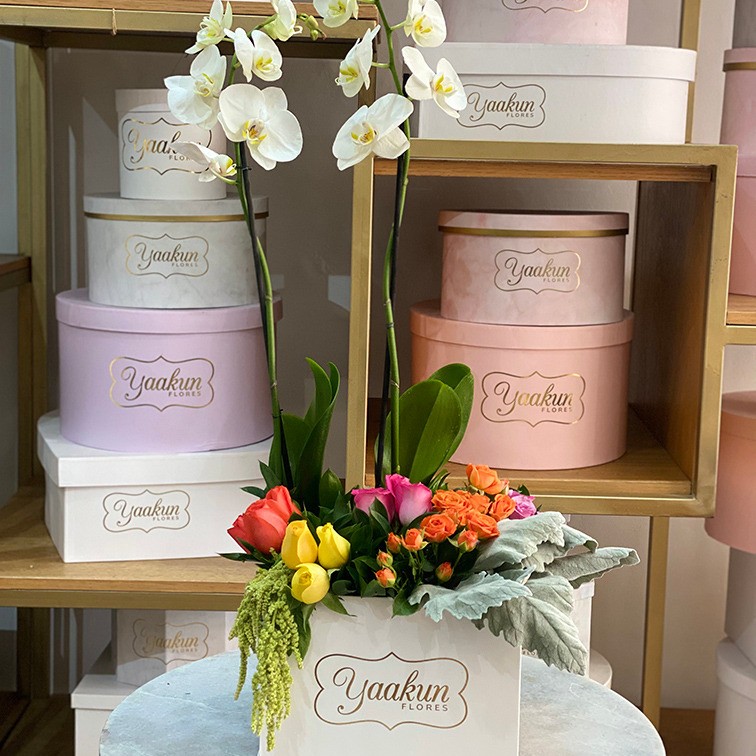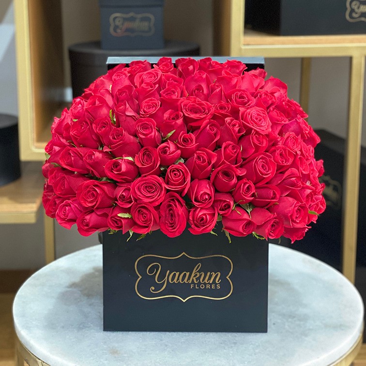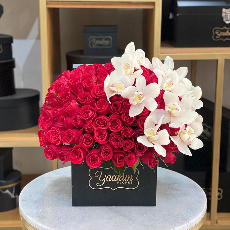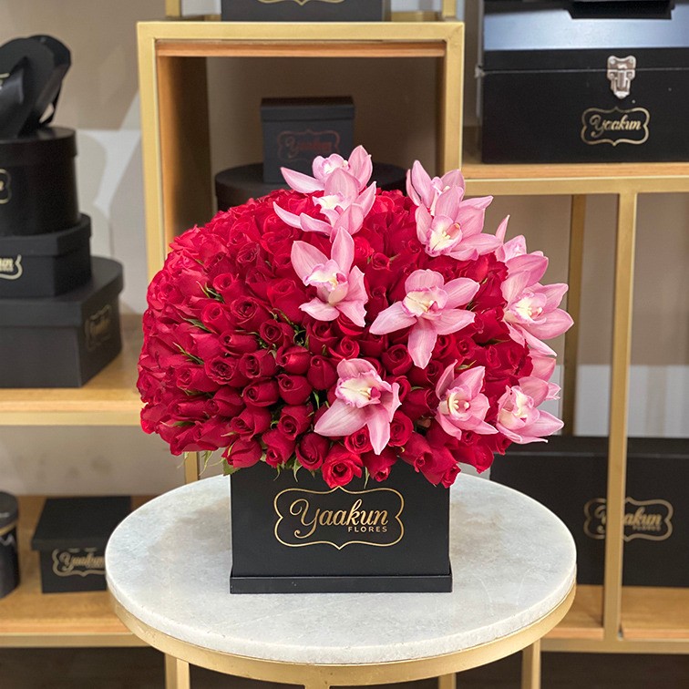 Sofisticado diseño elaborado con 150 rosas rojas y orquídeas blancas calidad Premium, sobre una caja Yaakun.