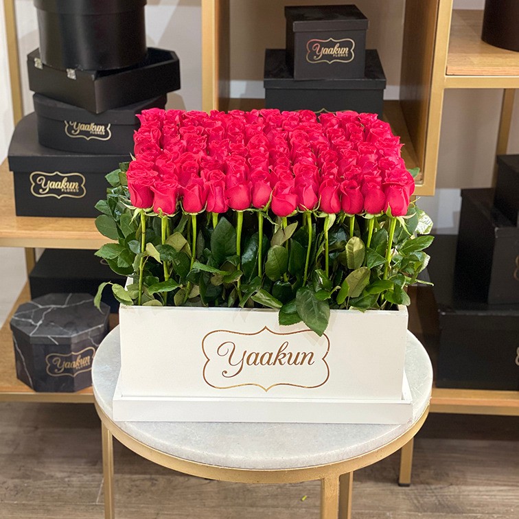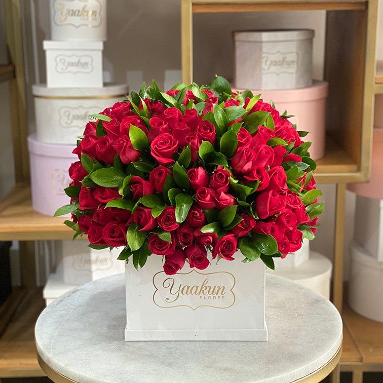 Bello diseño de jardín con 140 rosas rojas calidad de exportación en una caja blanca.