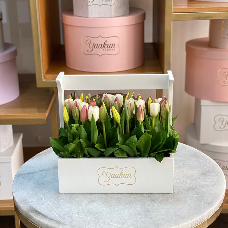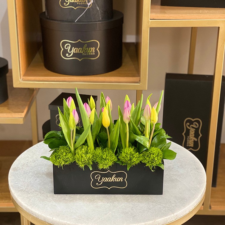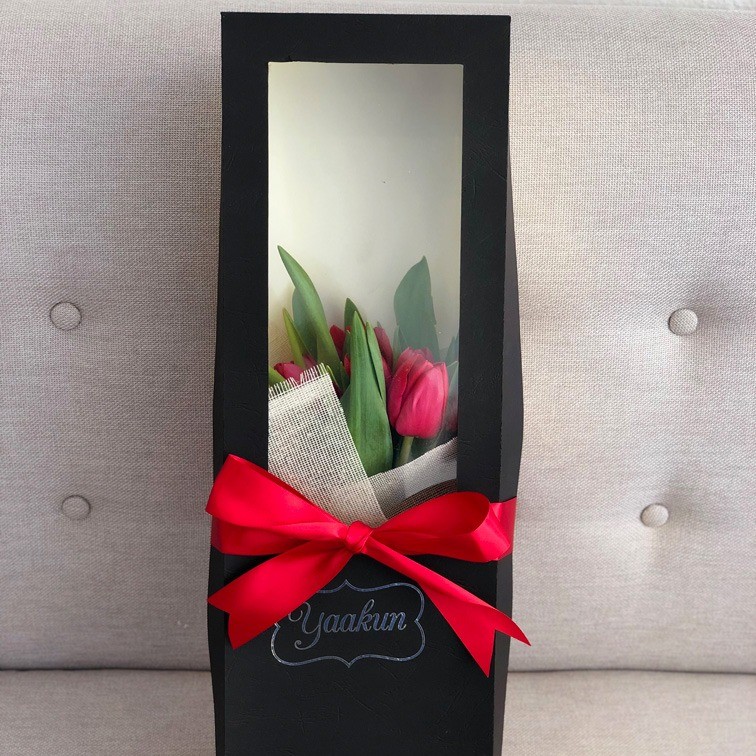 Preciosa caja en color negro con 10 tulipanes rosas en su interior.