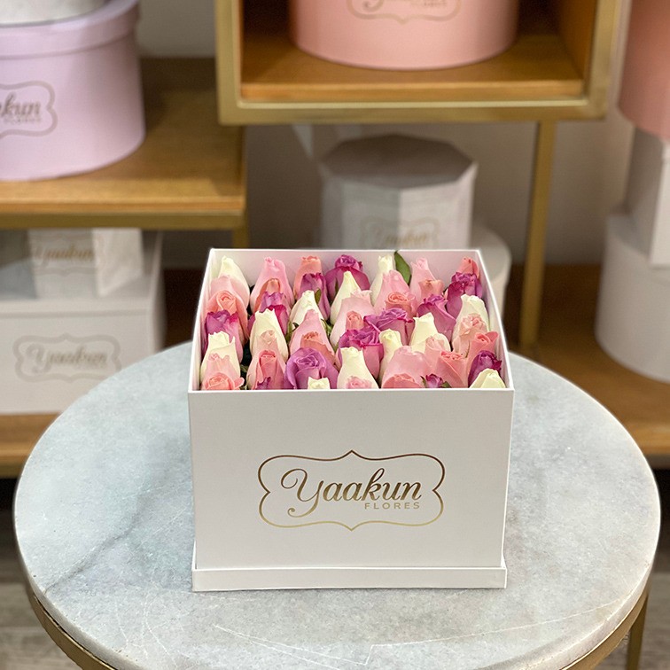 49 rosas de exportación en colores pastel en una caja Yaakun Premium en color negro.