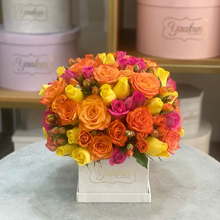 Diseño elegante en caja negra de Orquídeas y 80 rosas en tonos cálidos, mini rosas y follaje fino.
