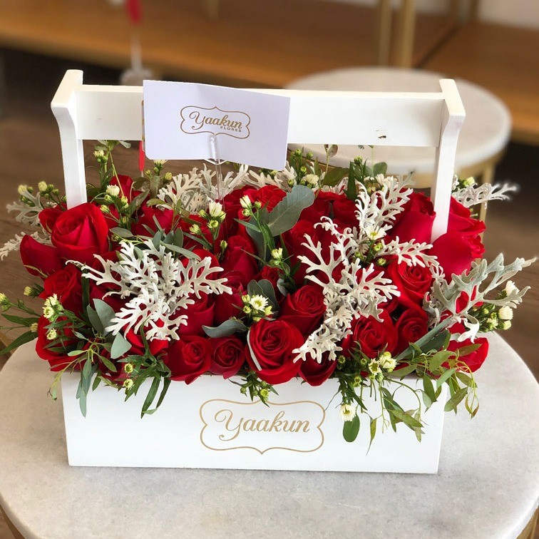 Jardinera en color blanco con 75 rosas rojas, follaje miller y guny.