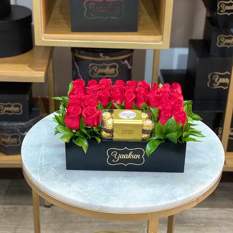 Sofisticado diseño con 40 rosas rojas y una caja de chocolates Ferrero Rocher.