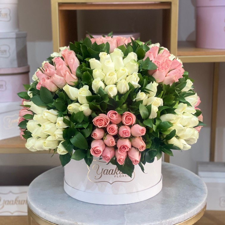 Hermoso y delicado arreglo floral con 250 rosas blancas y rositas con ruscus