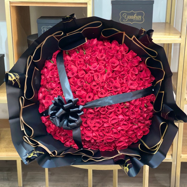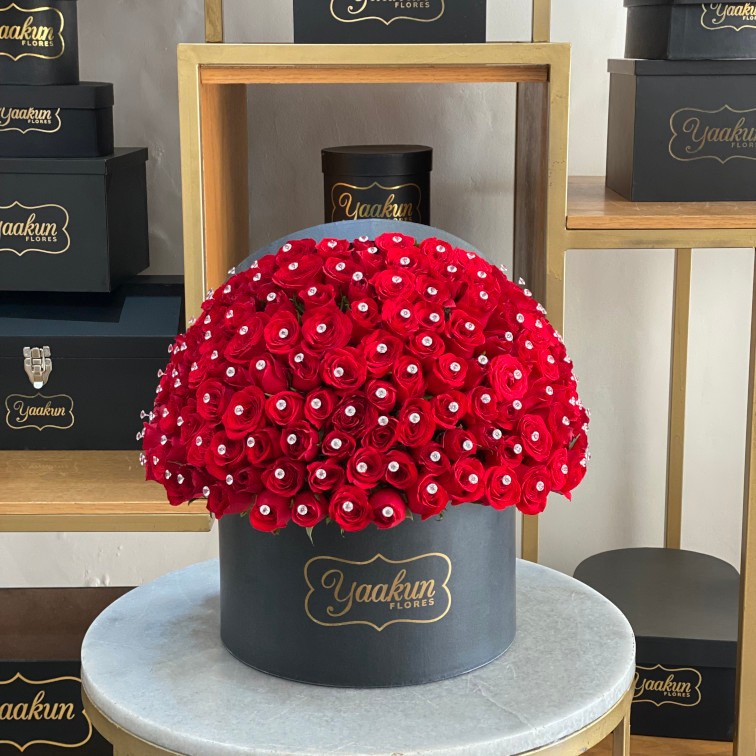 Clásico arreglo floral con 150 rosas rojas y toques con pines en caja negra