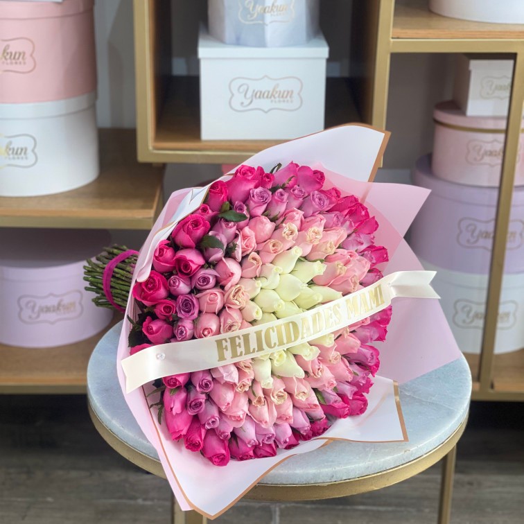 Hermoso arreglo floral con 100 rosas en tonos pastel degradados