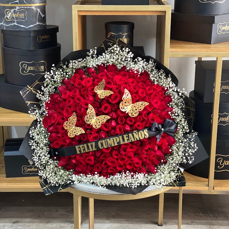 Hermoso arreglo floral con 250 rosas rojas y elegantes toques de gypso blanca con 4 mariposas y papel celofán