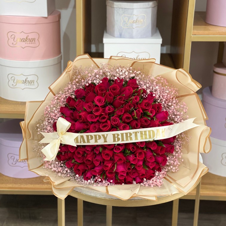 Hermoso arreglo floral con 100 rosas elegantes toques de gypso rosita y papel coreano