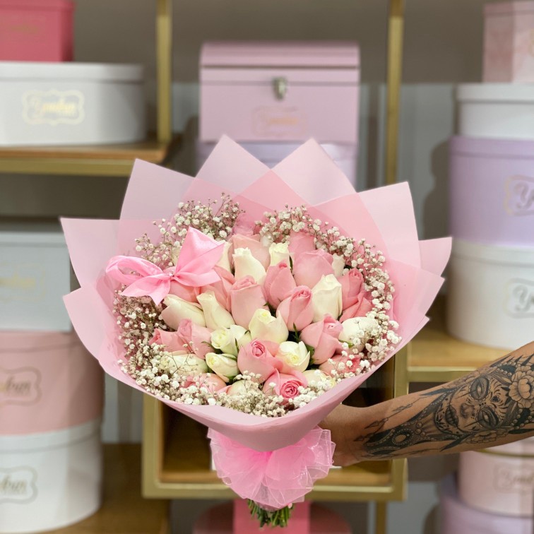 Hermoso y tierno arreglo floral tipo bouquet con 36 rosas rositas y blancas con toques de gypso y delicado mono de satín en papel coreano