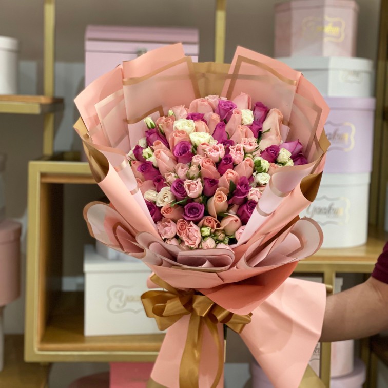 Hermoso y tierno arreglo floral con 50 rosas y toques de baby rose en papel coreano con moño