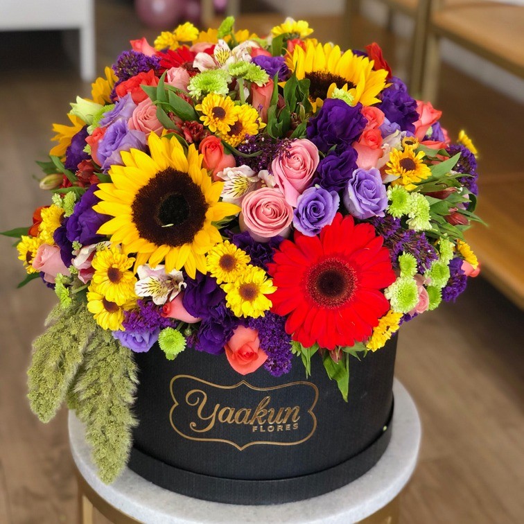 Regala esta hermosa caja primaveral con 25 rosas, girasoles, gerberas, astromelias, lisianthus, vikingos y crisantemos.