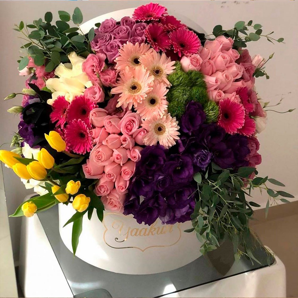 Hermoso diseño floral con 100 rosas, tulipanes, gerberas, lisianthus y follajes finos.