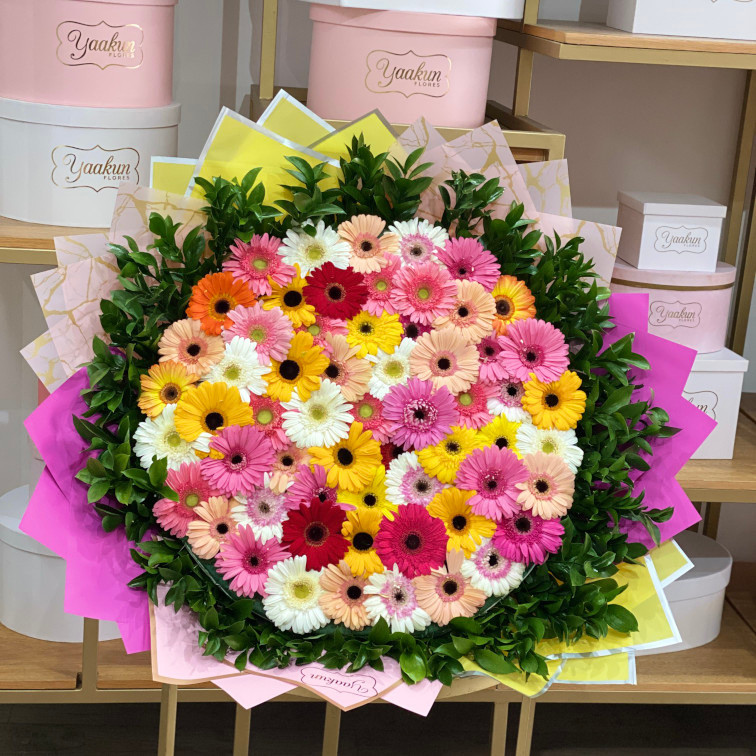 Hermoso diseño floral con geberas, 100 rosas, lisianthus, baby rose y follaje fino.
