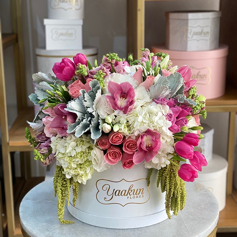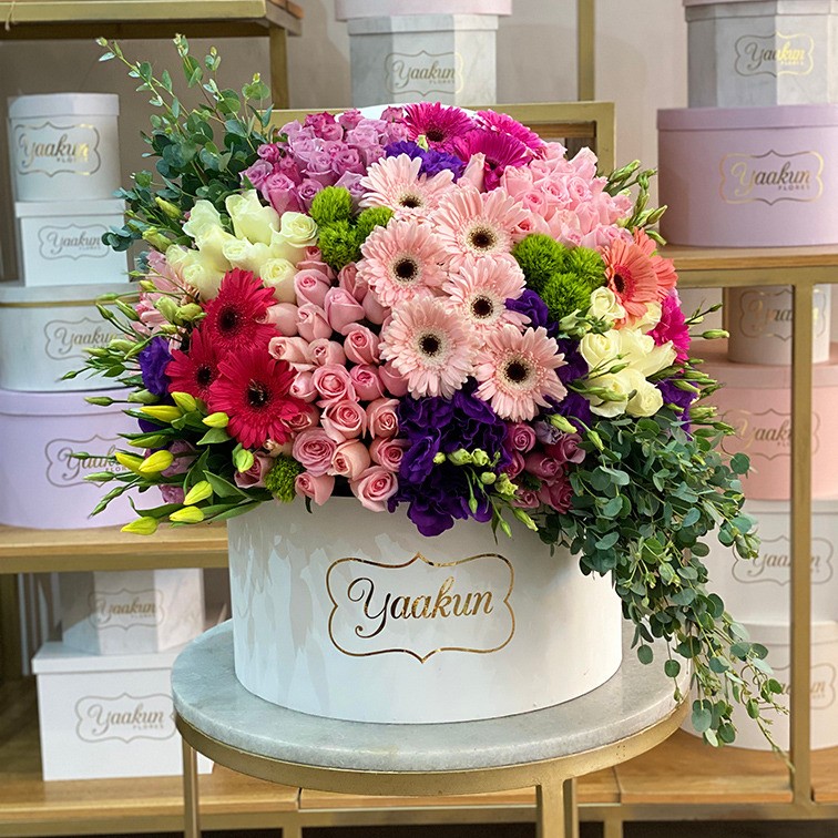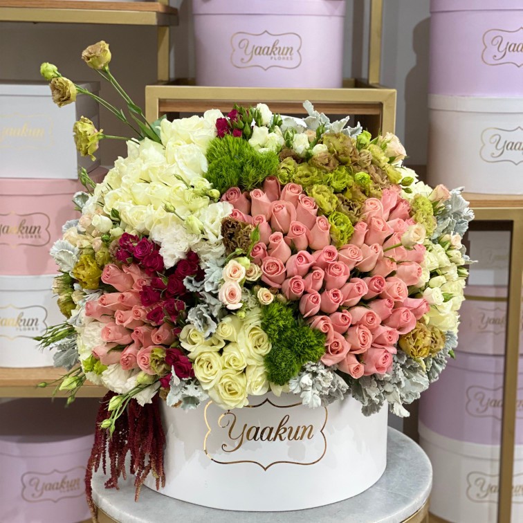 Hermoso diseño floral con 100 rosas, tulipanes, gerberas, lisianthus y follajes finos.