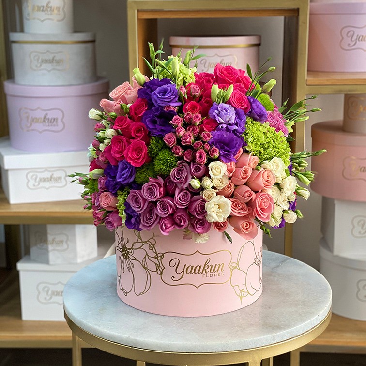 Hermoso y colorido arreglo floral con 50 rosas, vikingos, lisanithus, miller y limonium