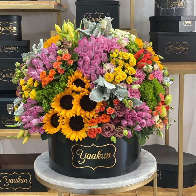 Hermoso diseño primaveral con 150 rosas, baby roses, girasoles y follajes finos.