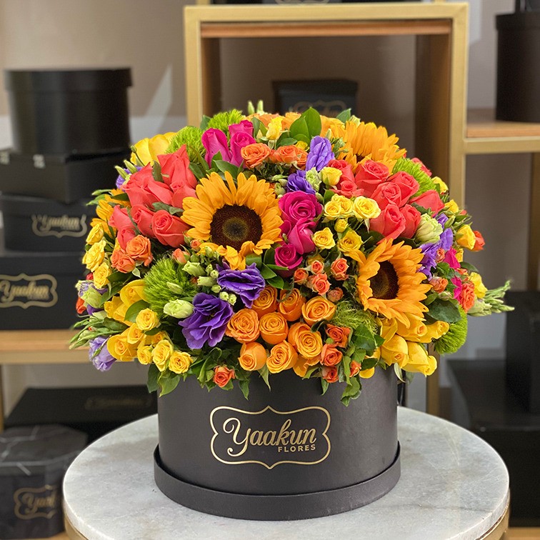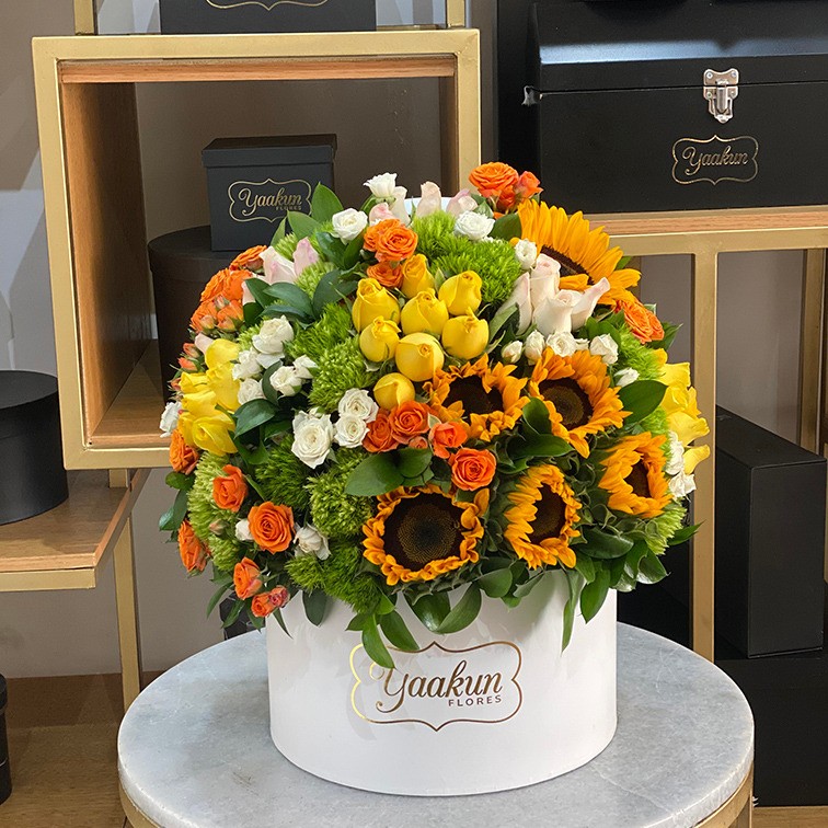 Diseño primaveral de colores vibrantes con 100 rosas, baby roses, girasoles, lisianthus green y follajes finos.