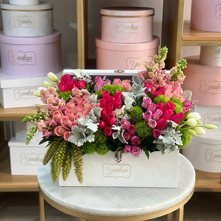 Hermosa cofre con rosas, tulipanes, flores y follajes finos.