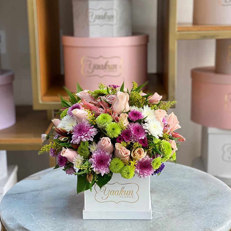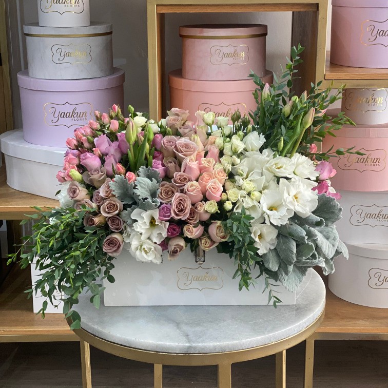 Diseño floral en caja ovalada blanca con 150 rosas en tonos pastel y toques de lisianthus, gyny, Miller y safari tinto