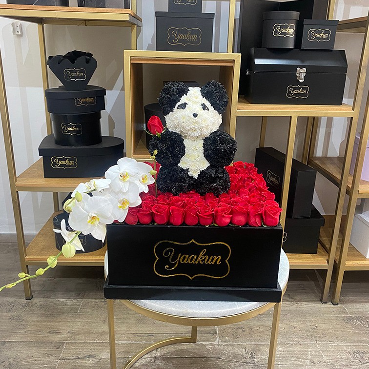 Arreglo floral con 120 rosas aproximadamente más la escultura de osito panda y un el agente toque de orquídeas blancas phalenosis