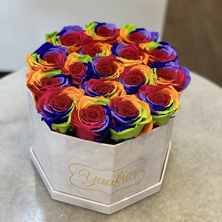 Hermoso diseño floral en caja octagonal con 18 rosas arcoriris aproximadamente, en tonos intensos